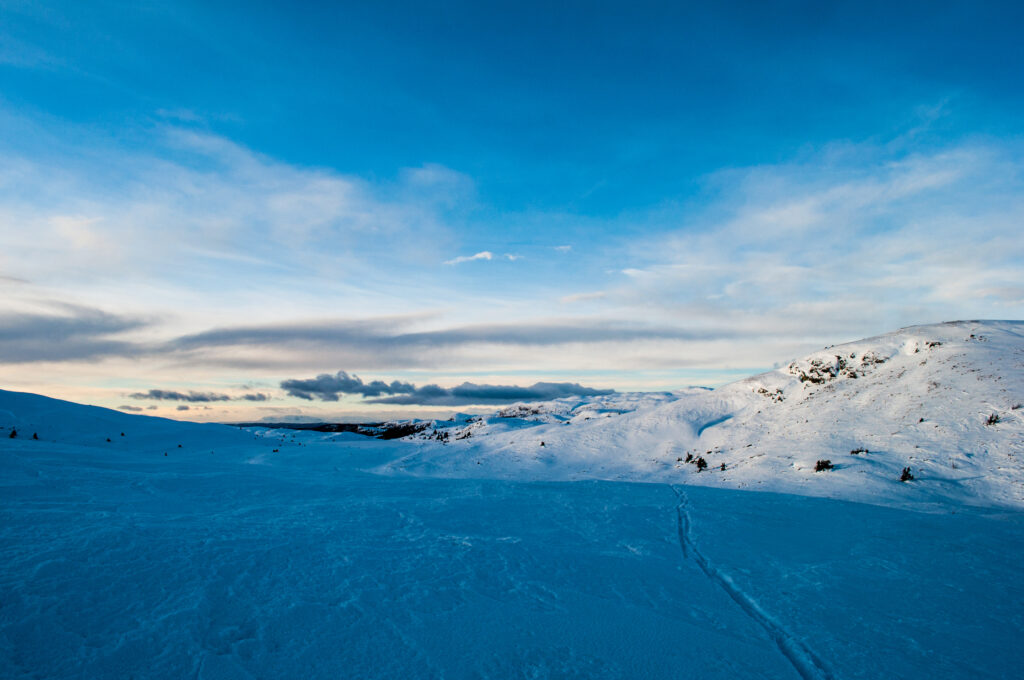 Vel nede begynte jeg turen mot Rauddalsfjellet. Ved å følge preparerte løyper til Vesle Grevsjøen først, var det bare å følge den sommerlige merket ruten på kartet til topps! Egentlig en fryd og bare traske oppover med feller! Med samme stigning, en hengiven vind som konstant tuklet med sine kalde fingre på samme kinn og med sola gjemt bak toppsiktet, føltes dette som en langt lengre oppstigning enn den kronglete veien opp til Rabalsfjellet.