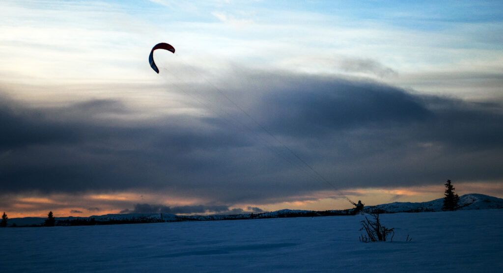 Jeg parkerte bilen, klemte på fellene og begynte å traske etter flotte løyper opp mot høgda. Det var faktisk nesten helt vindstille denne dagen! Det er ikke lange biten fra Høvreslia og opp på flata. Det var noe jeg ikke har tenkt på før, men som jeg fikk se, at det er fult mulig å kite her! Når jeg begynte å nærme meg flata så jeg snurten av en kite som lekent fulgte vindens tanker.