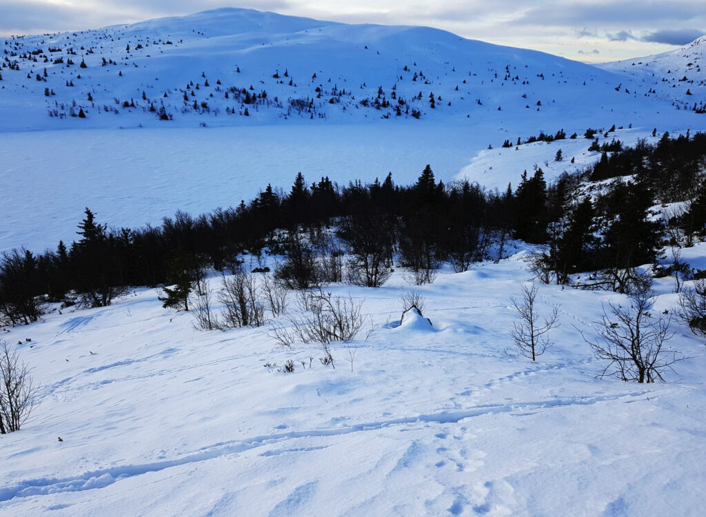Fra Høvreslia er det egentlig bare å følge den preparerte løypen helt inn til «sinsenkrysset», for de med et kart blir det skikrysset mellom Ormtjernet og Rabalstjernet. Her fra valgte jeg rett og slett å peile meg ut egen løype direkte mot og over Rabalstjernet, siden første mål var nettopp den veien.